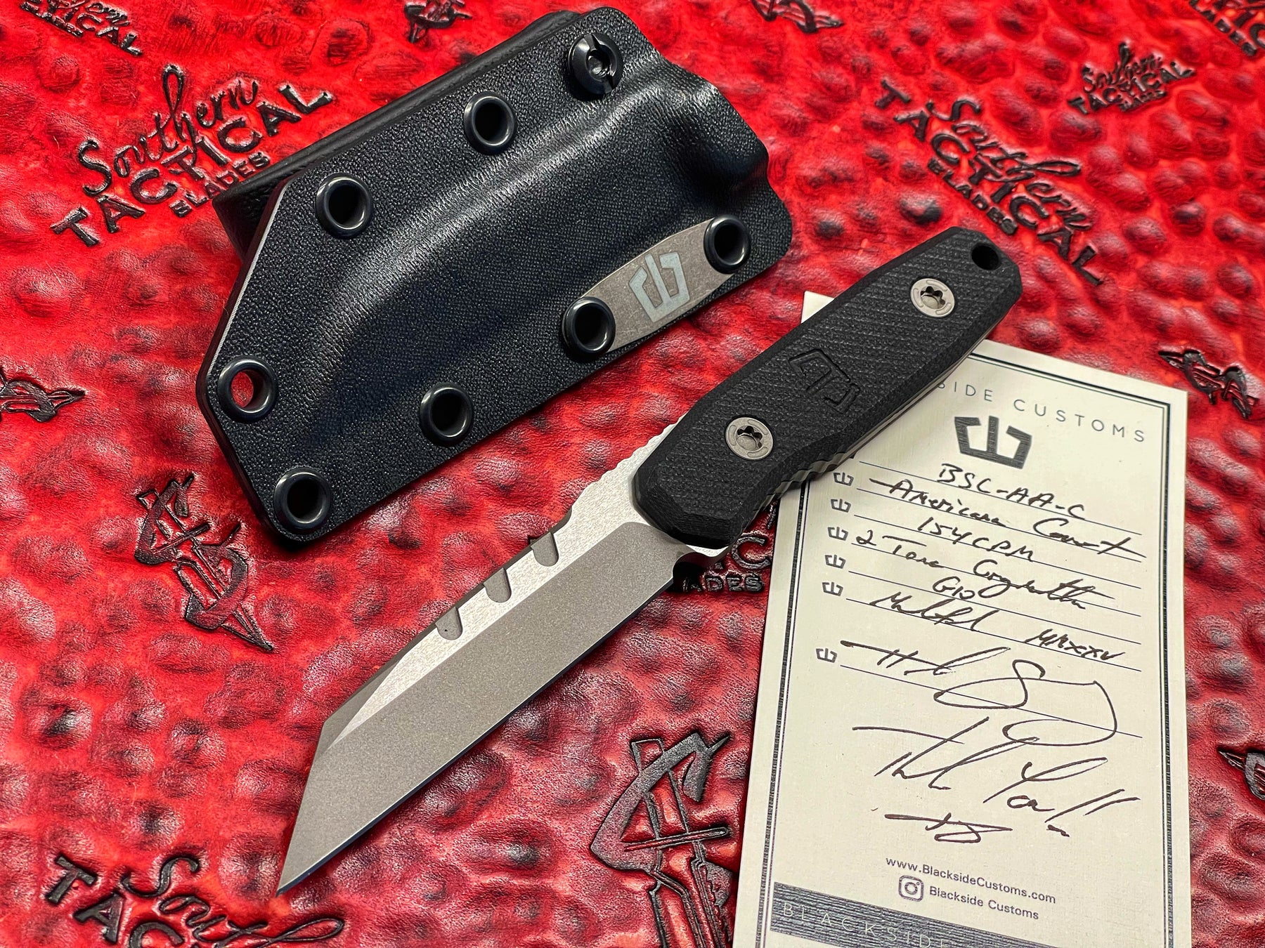 The Blackside Customs Americana Covert is a sleek fixed blade designed for those who value performance and subtlety. Measuring 8.4” overall, it features a 4.25” CPM-154 blade with a bold two-tone Graymatter finish, providing both cutting efficiency and modern styling. The 4.15” G10 handle offers exceptional grip and control without unnecessary bulk, while the black Kydex sheath with IWB loop ensures reliable carry options for everyday or professional use.