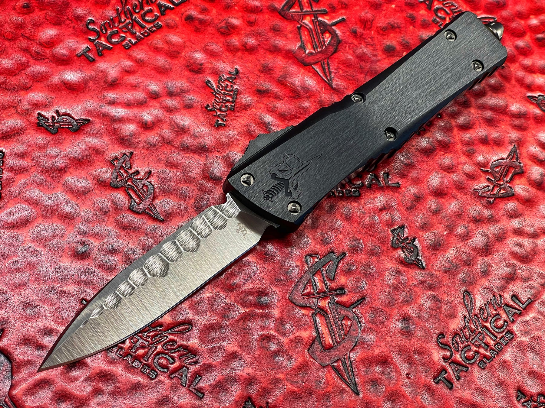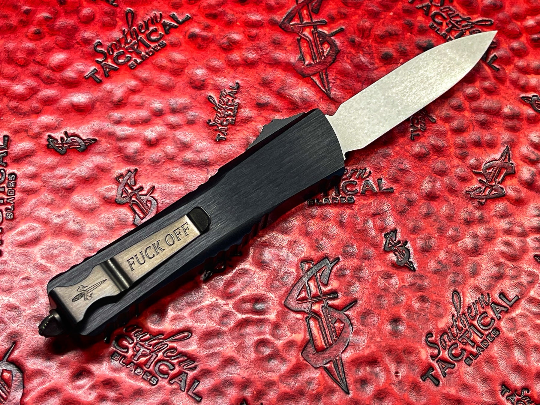 Marfione Custom Knives / Borka Blades Collaboration Combat Troodon, Chisel Grind, Borka Signature Rocker Grind, Black Hefted Aluminum Alloy Chassis, Carbon Fiber Button, DLC Two-Tone Hardware. DLC “Fuck Off” (Family Only) Pocket Clip. 1 of 3 Made.