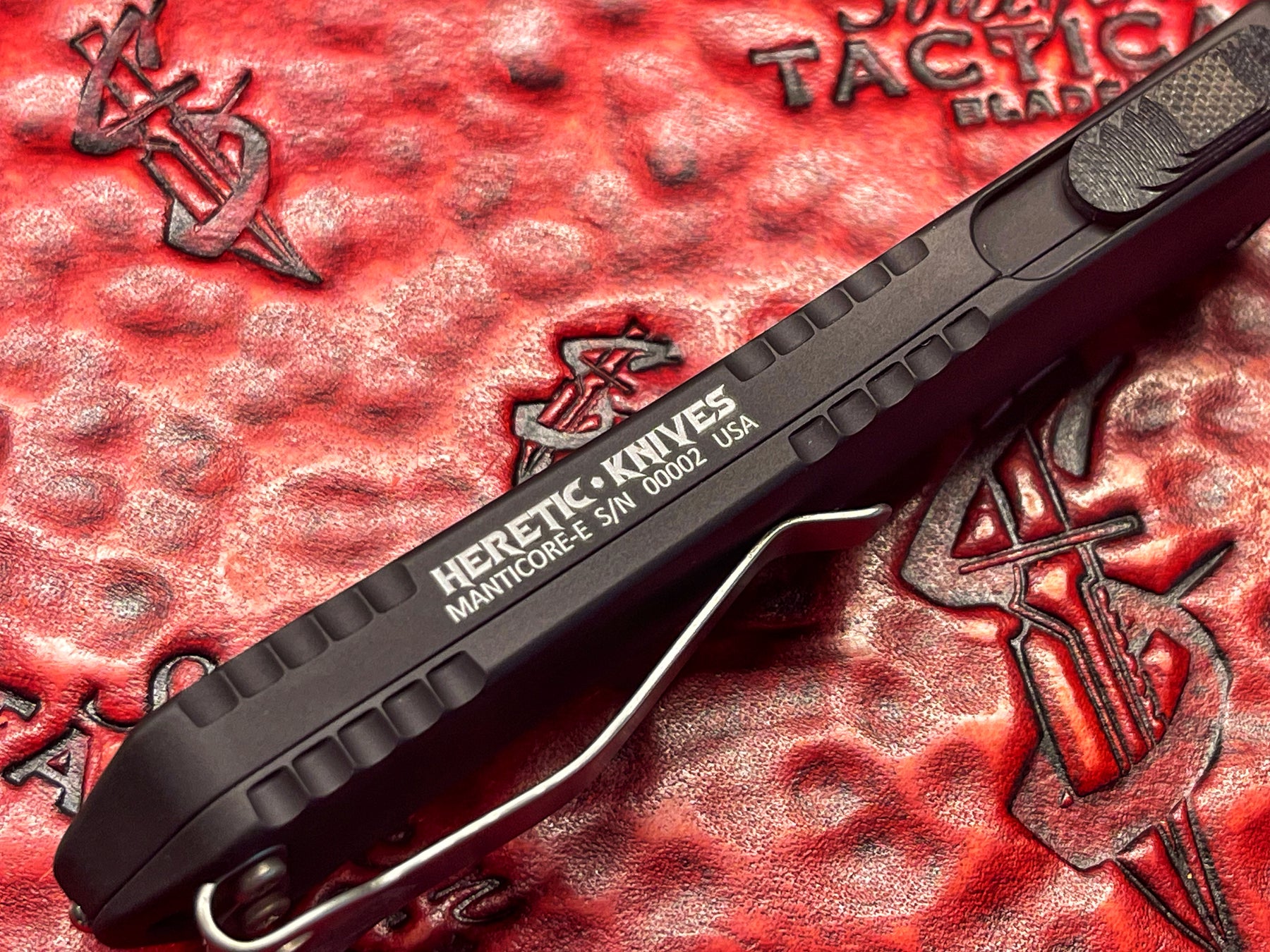 Heretic Knives Manticore E, Double Edge Stonewash Standard Double Action OTF SN 002