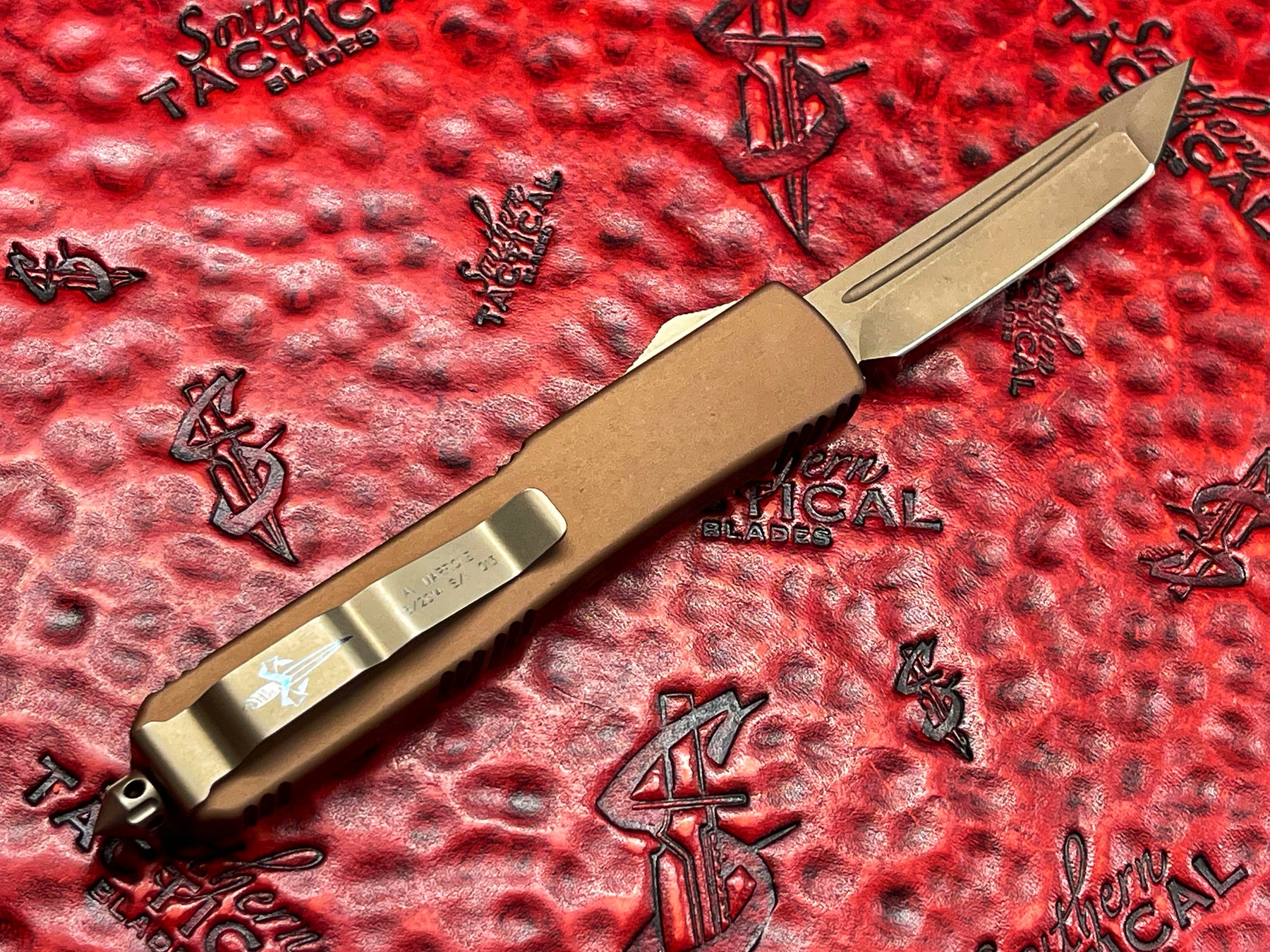 This Marfione Custom Ultratech Desert Tactical is a rugged, highly collectible OTF that blends elite custom craftsmanship with a battle-ready aesthetic. Featuring a Bronzed Tri-Washed Tanto blade, this piece delivers a uniquely distressed finish that enhances durability while giving the knife a hardened, desert-worn appearance. The tanto geometry adds strength and piercing power, making this one of the more aggressive Ultratech configurations.