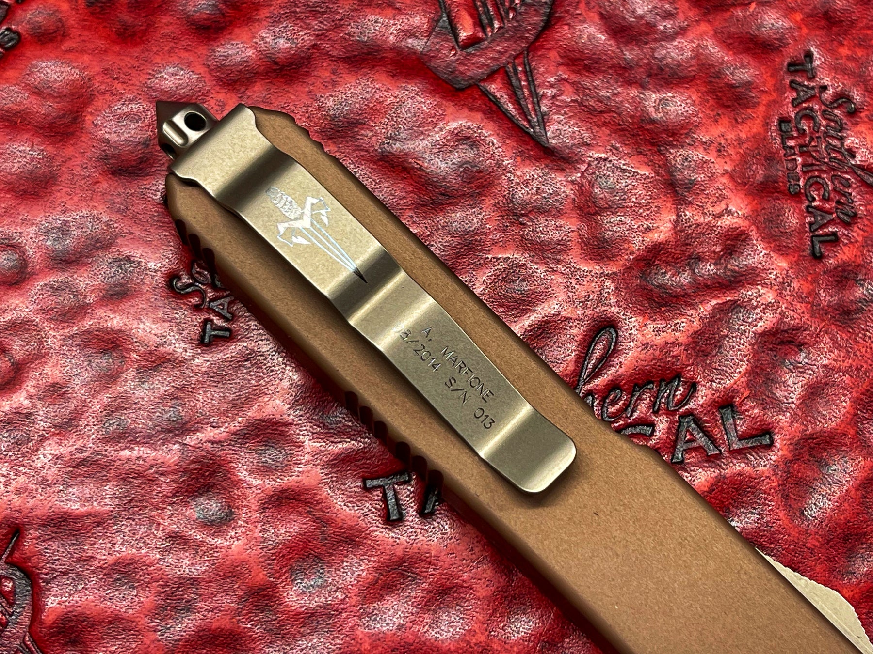 Serialized and paired with its COA and custom pouch, this Desert Tactical variant is a standout piece from the earlier era of Marfione Custom Knives — making it increasingly desirable among collectors.