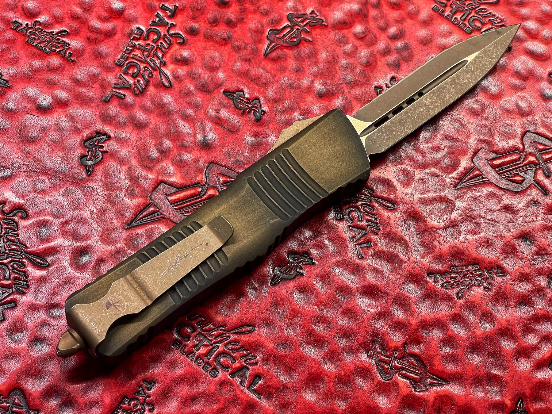 Microtech Combat Troodon Double Edge Bronze Apocalyptic Full Serrated Antique Bronze Signature Series Double Action OTF Knife
