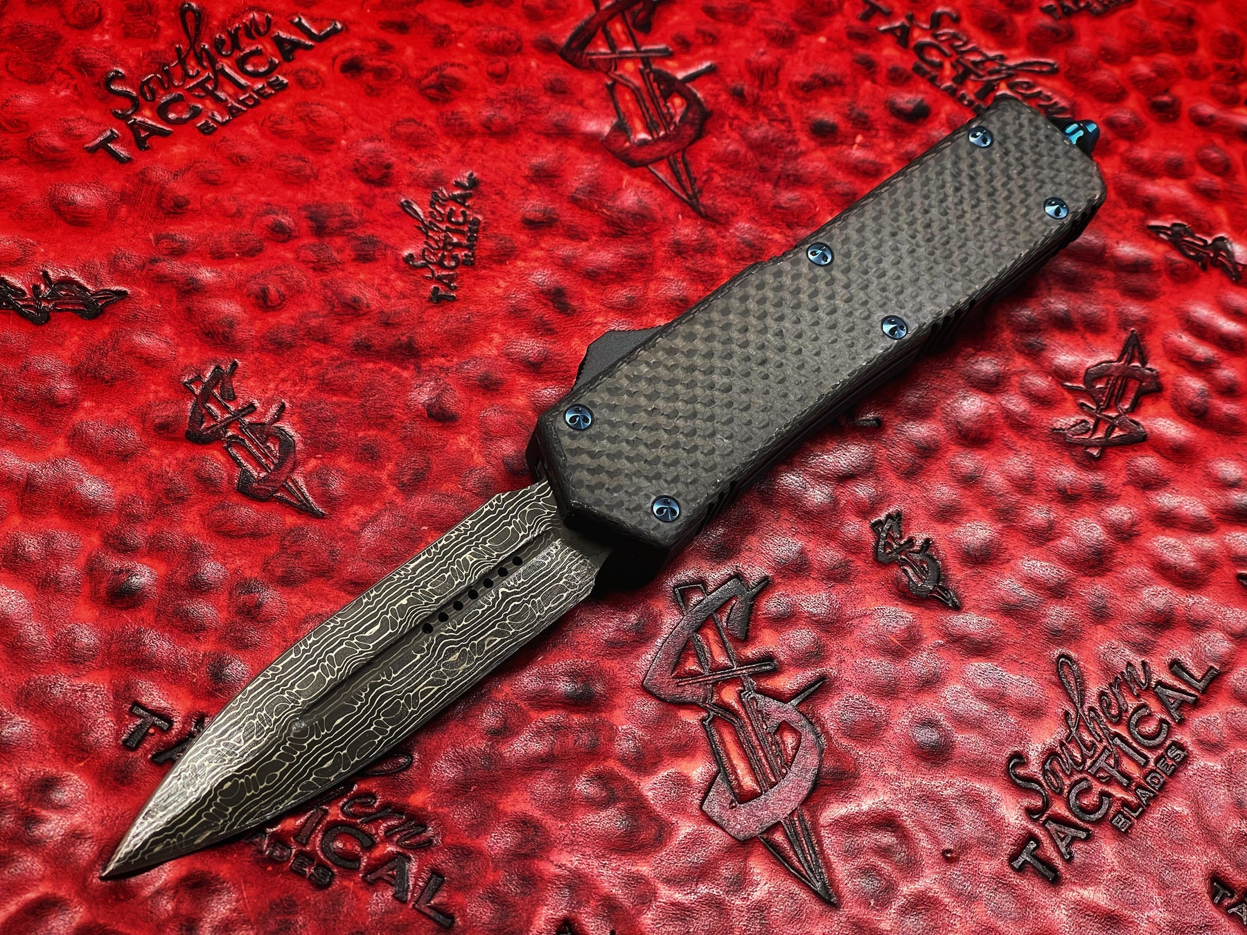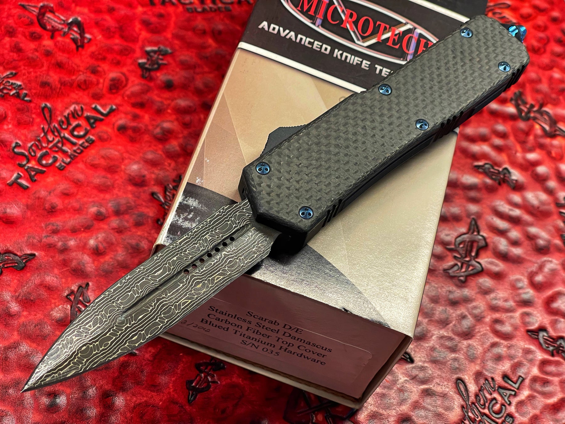 Vintage Microtech Scarab Double Edge, Stainless Steel Damascus, Carbon Fiber Top, Blued Titanium Hardware, Double Action OTF Knife