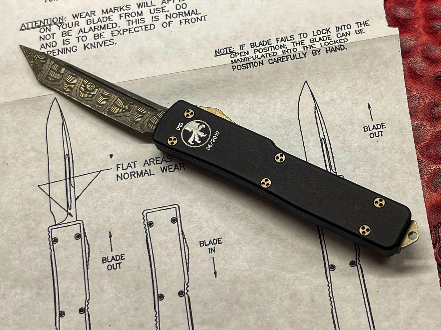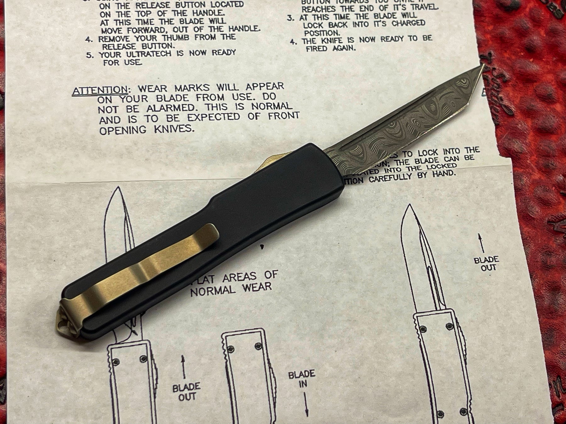 The bronze hardware sets this example apart, adding a warm, custom-style contrast to the chassis while giving it that premium aesthetic Microtech fans love. From the screws to the firing switch, the bronze accents blend perfectly with the Damascus blade, creating a cohesive and highly desirable colorway.