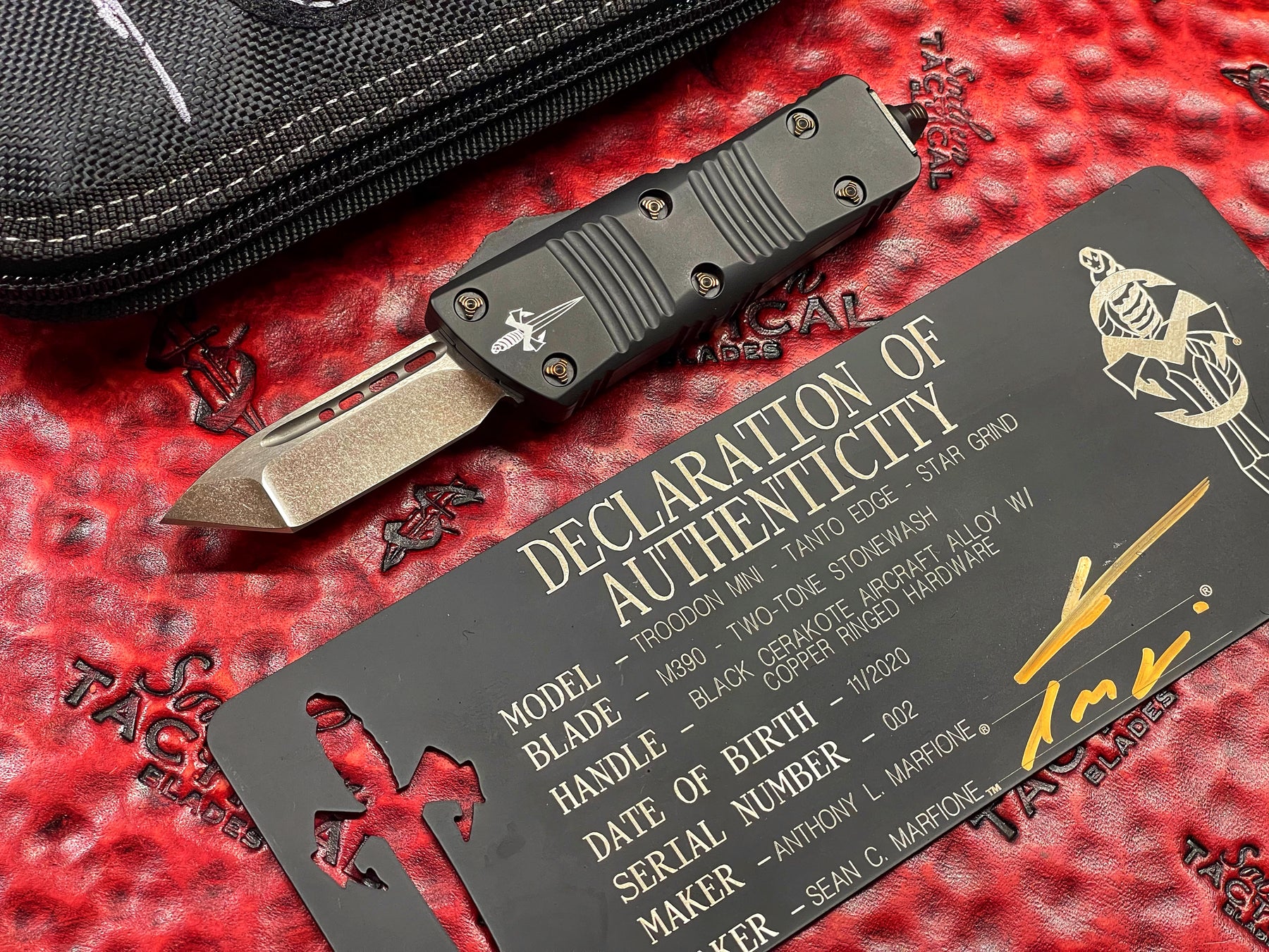 This Marfione Custom Troodon Mini exemplifies the precision, style, and performance that define Anthony Marfione’s work. Compact yet powerful, it features a hand-finished M390 Tanto blade with the signature Star Grind, offering exceptional cutting geometry and striking visual depth. The black Cerakote aircraft alloy handle is accented by copper-ringed hardware, balancing stealth aesthetics with a touch of luxury. Smooth, snappy deployment and flawless detailing make this a standout piece for collectors and everyday carriers alike.