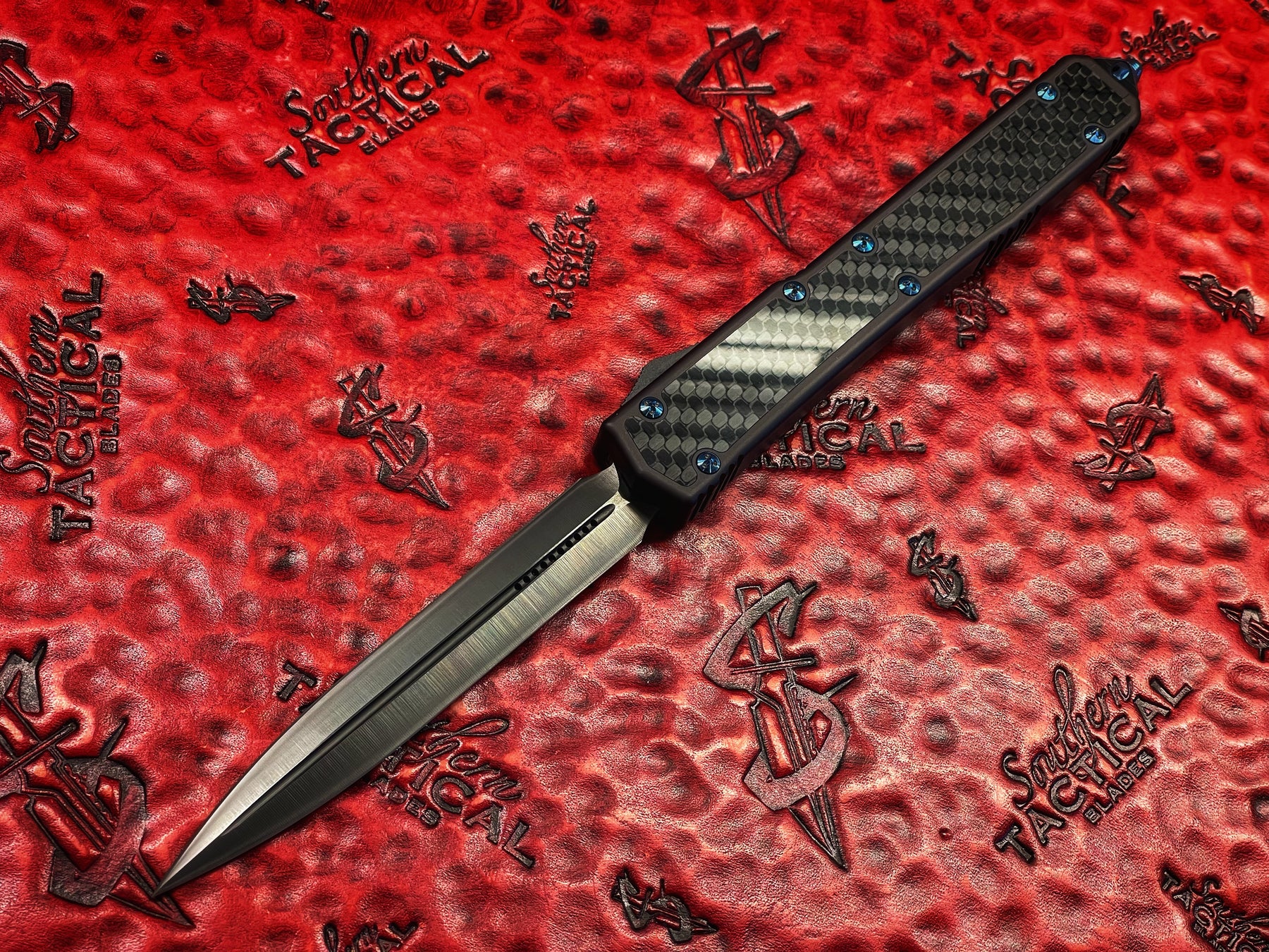 Microtech Knives Makora II, Double Edge Satin DLC, Carbon Fiber In-lay, Blue Titanium Accents, BLACK DIAMOND EDITION, Double Action OTF Knife