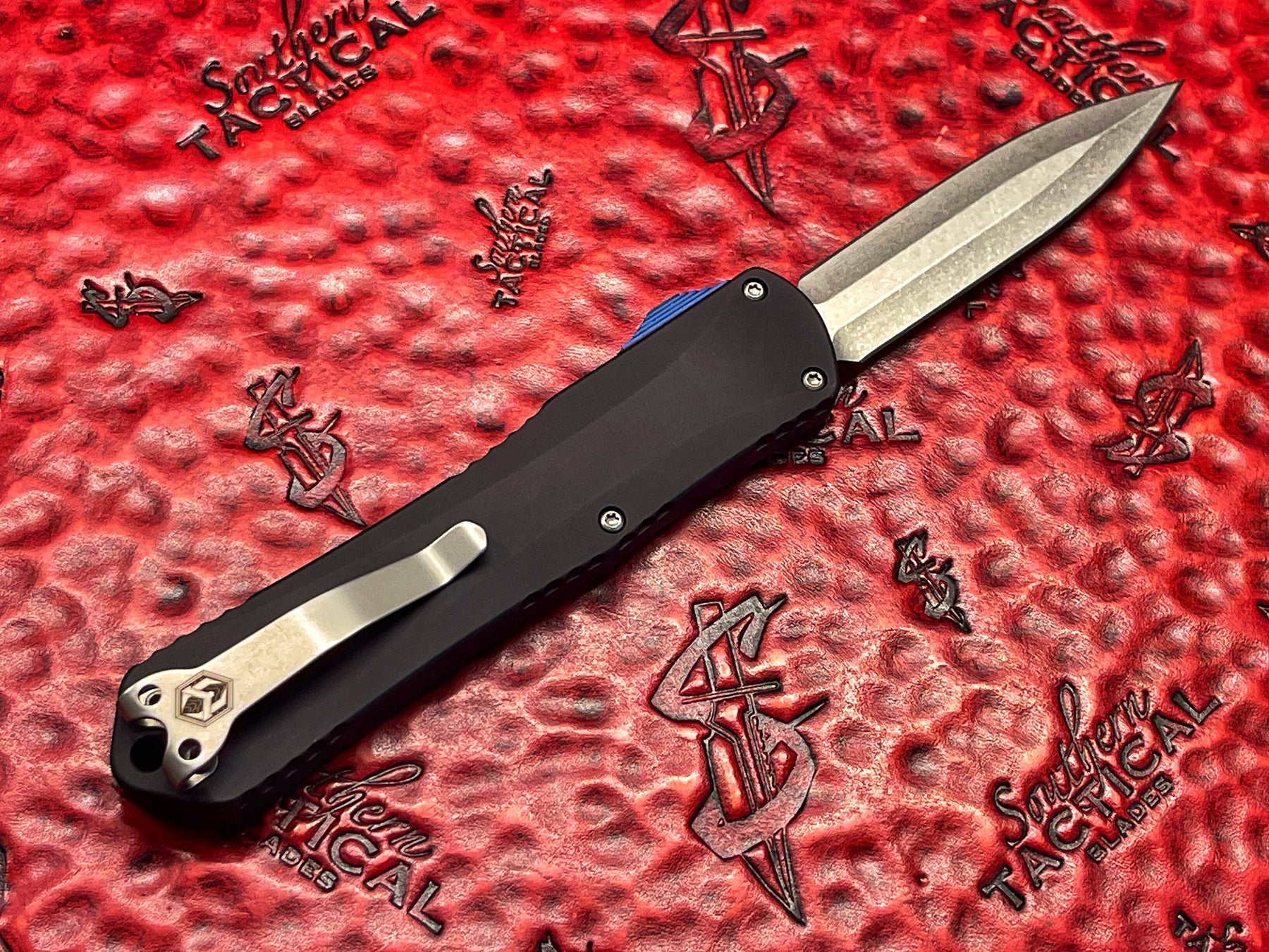 Heretic Knives Manticore X Blade Show Special 2020, Double Edge Stonewash, Blue G10 Button, Double Action OTF