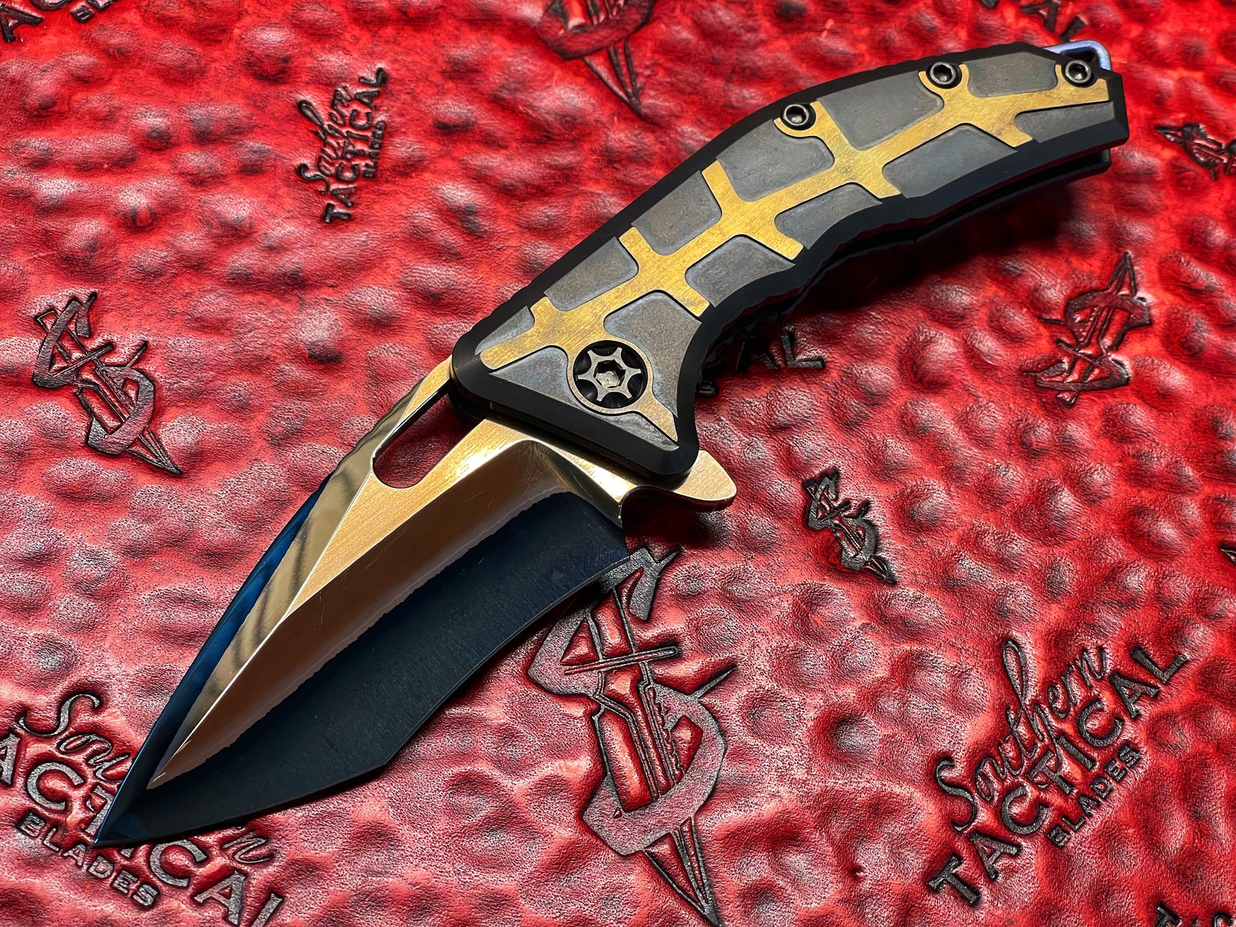 Bold, luxurious, and unapologetically aggressive, the Heretic Martyr Recurve is a limited-production masterpiece that pushes the boundaries of design and performance. The blade is crafted from double clad steel with a stunning blued high-polish finish, creating a deep, iridescent sheen that turns heads while offering precision cutting and durability. The handle features DLC-coated brass, delivering an ultra-tough, corrosion-resistant surface with the rich weight and feel of classic metals—blacked out for a modern, tactical aesthetic.