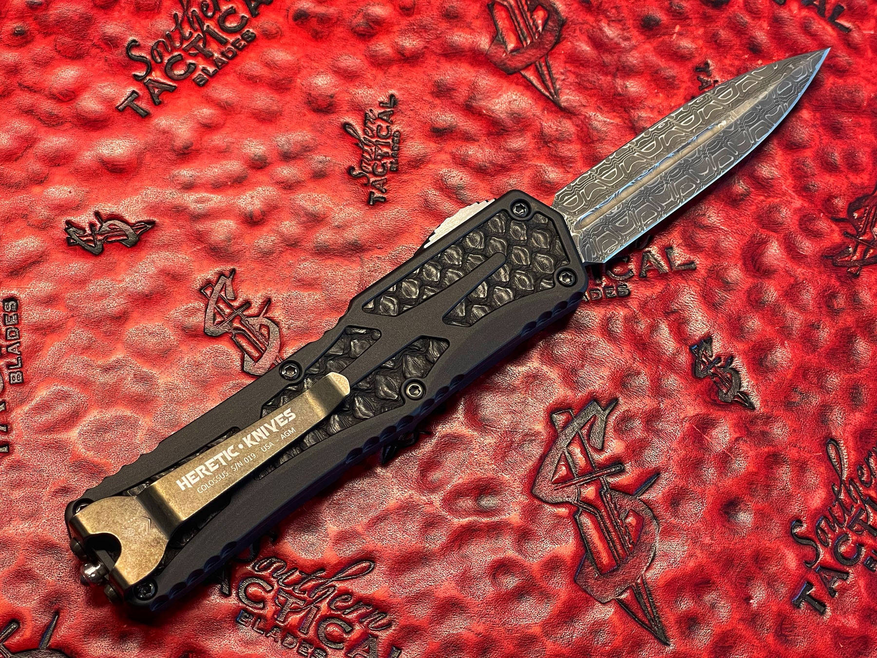 Heretic Knives Colossus, Hand Ground Double Edge, Vegas Forge Reptilian Damascus, Anodized Aluminum, Black Python Inlays, DLC Hardware, Double Action OTF Knife
